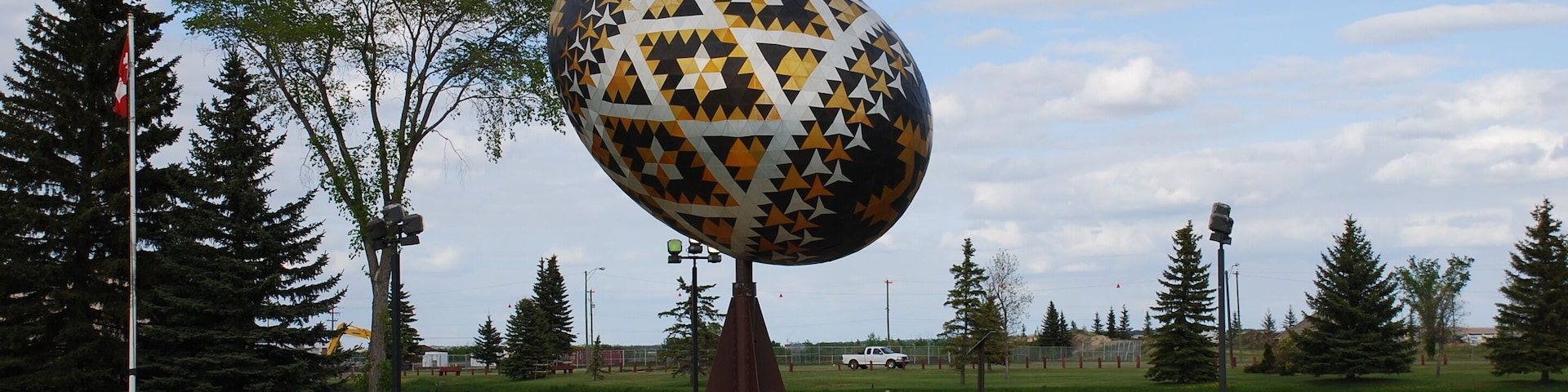 The Vegreville egg is a giant sculpture of a pysanka, a Ukrainian-style Easter egg. The work by Paul Maxum Sembaliuk is built of an intricate set of two-dimensional anodized aluminum tiles in the shape of congruent equilateral triangles and star-shaped hexagons, fashioned over an aluminum framework. The egg is 31 ft (9 m) long and three and a half stories high, weighing in at 2.5 t (5,512 lb). It is the second largest pysanka in the world. The biggest one was built in Kolomyia, Ukraine in 2000.