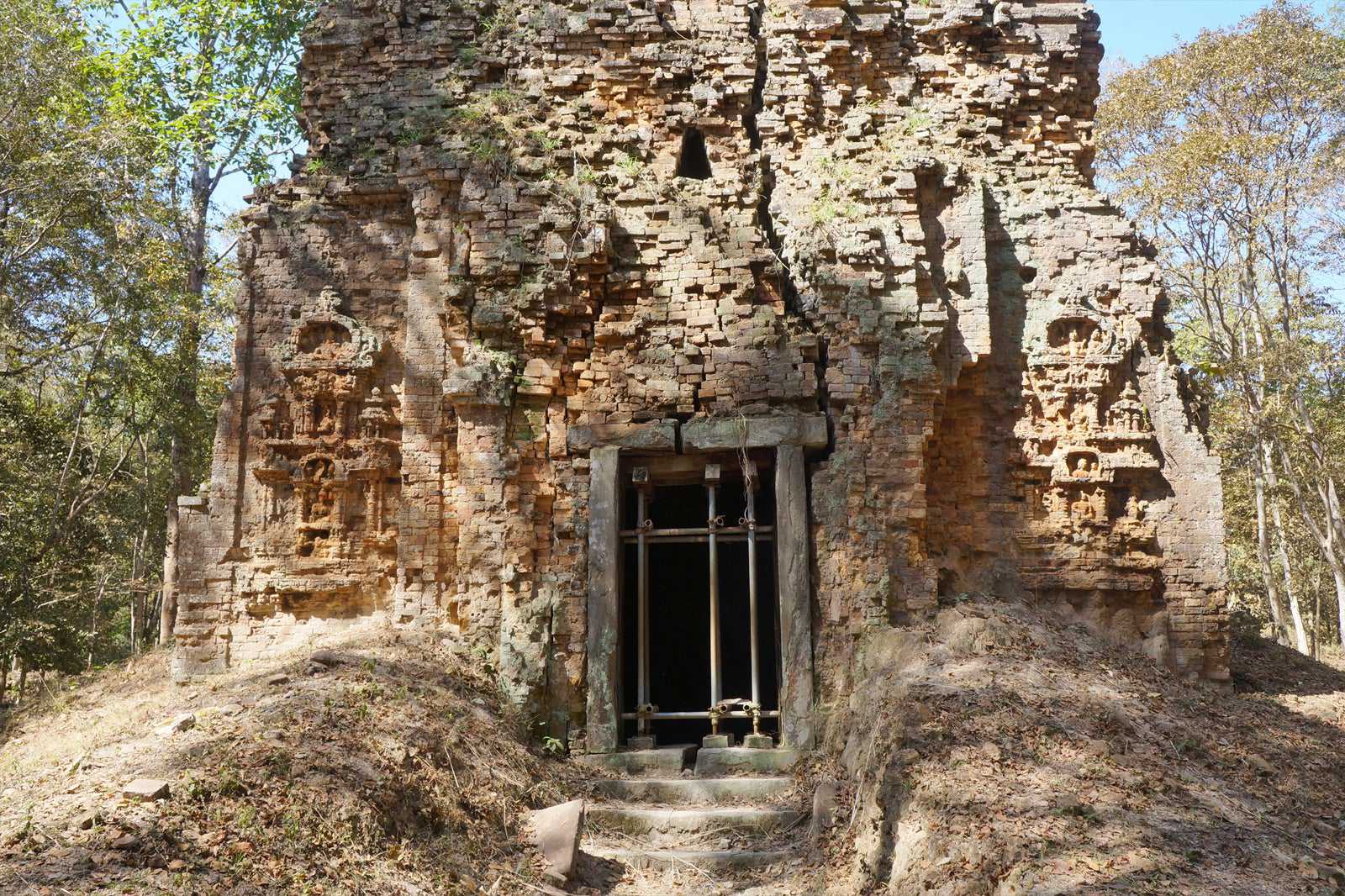 The ruins at Sambor Prei Kuk are groups of striking brick prasats, in varying states of decay. The 3 main complexes are Preah Sambor (North Group), Preah Tor (Central Group), and Preah Yeay Poun (South Group). Each is walled, and each contains a number of prasats or towers. The carvings on some of the lintels, columns and pillars of the prasats are in relatively good shape and are very good examples of pre-Angkorian art.
