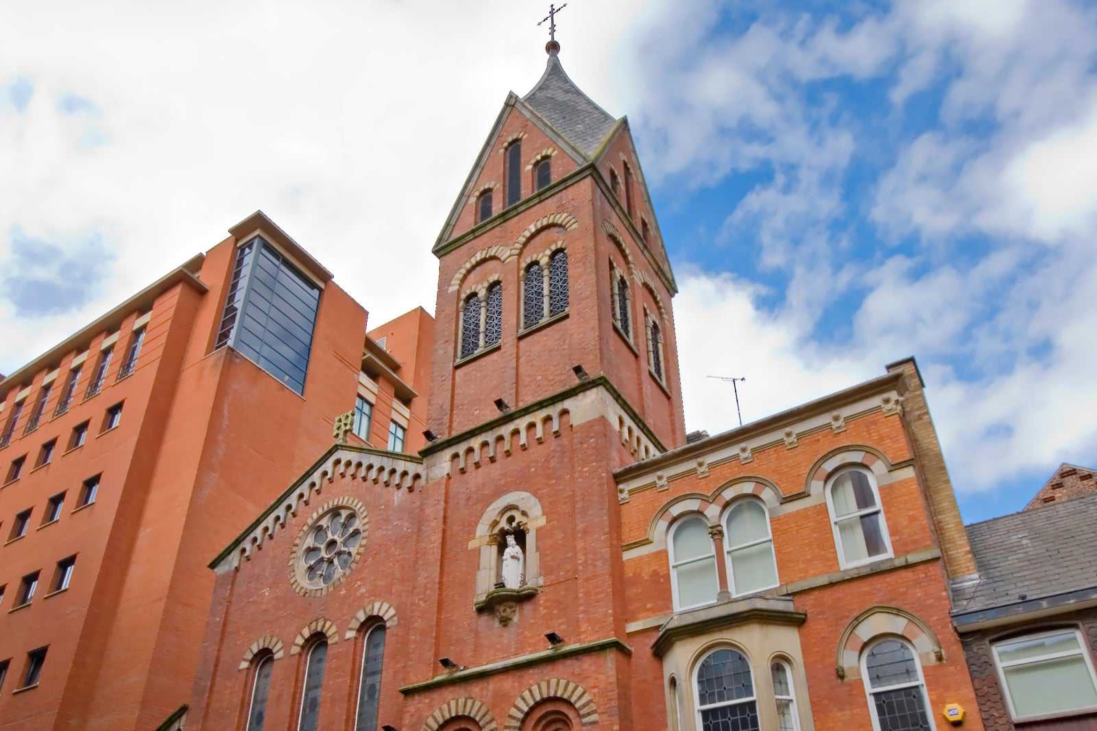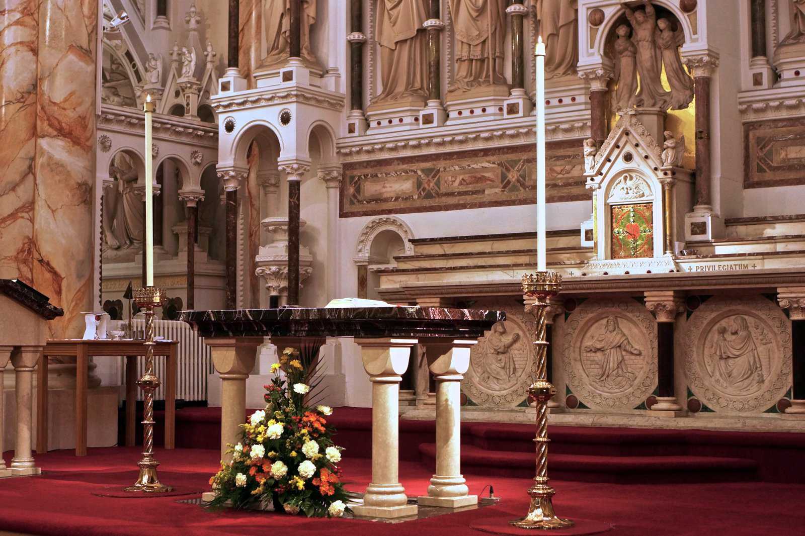 Inside, the carvings are notably Victorian with a marble high altar. Being a Catholic Church, images of Our Lady are prevalent throughout with additional imagery of St Stephen, St Patrick, St Peter and more. Above the tabernacle, you can spot Christ bearing the Sacred Heart.