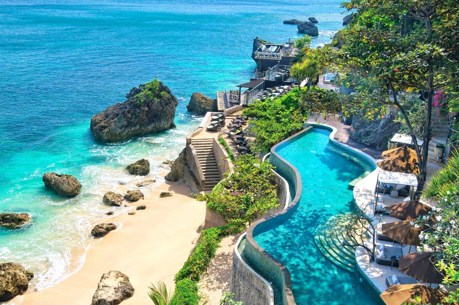 Getting to the bar itself is an experience. Past AYANA’s green cliff-top lawns, you’ll notice 2 ways to descend, both of which provide spectacular bird’s eye views. First is the ‘hard way’ down the extended flight of stairs that leads you to Kisik Bar & Grill, the resort's fine seafood restaurant with tables on the sand. Continuing to the Rock Bar, you stroll along the cliff base causeway around a freeform ocean beach pool.