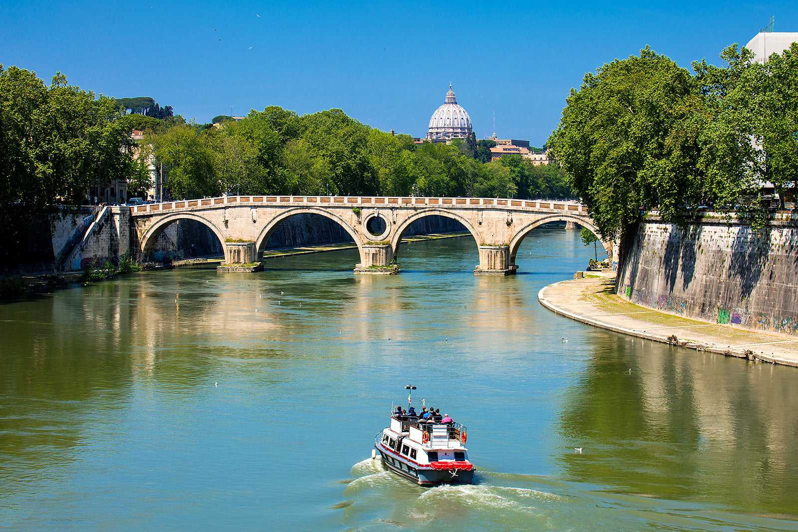 Ponte Sisto in Rome is a pedestrian bridge; cars are not permitted to drive across. This makes it an ideal way to capture stunning views of the Tiber River and the city shoreline on both sides, which are sure to light up any social media feed. You can also see the bridge from the water by booking passage on a tour boat or ferry.