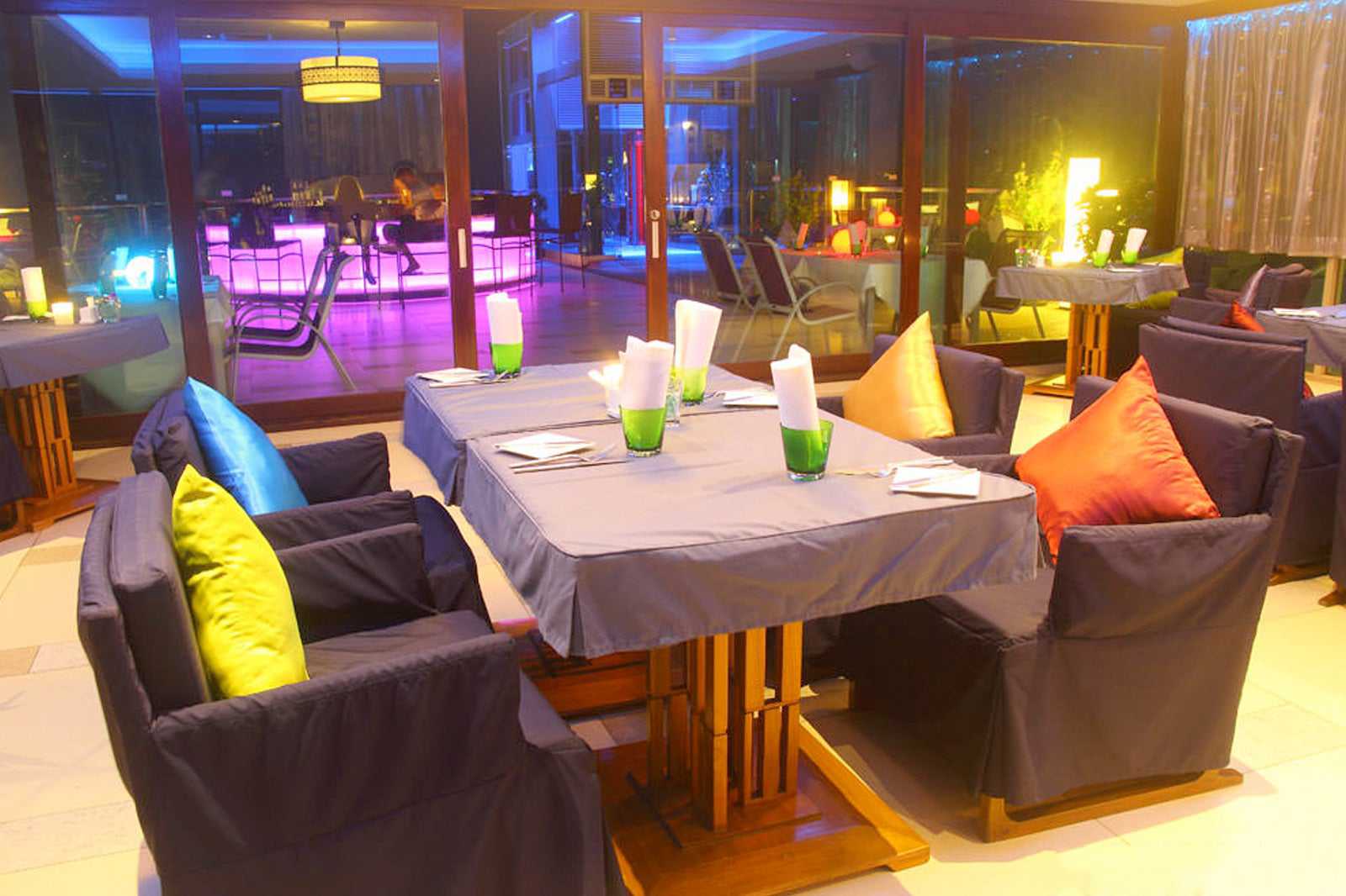 The central part of KEE Sky Lounge is its large circular bar, where skilled bartenders demonstrate their flair while preparing cocktails. The décor is classy in a beige and soft grey theme, while the violet-coloured aluminium furniture is modern and complemented by white tablecloths.