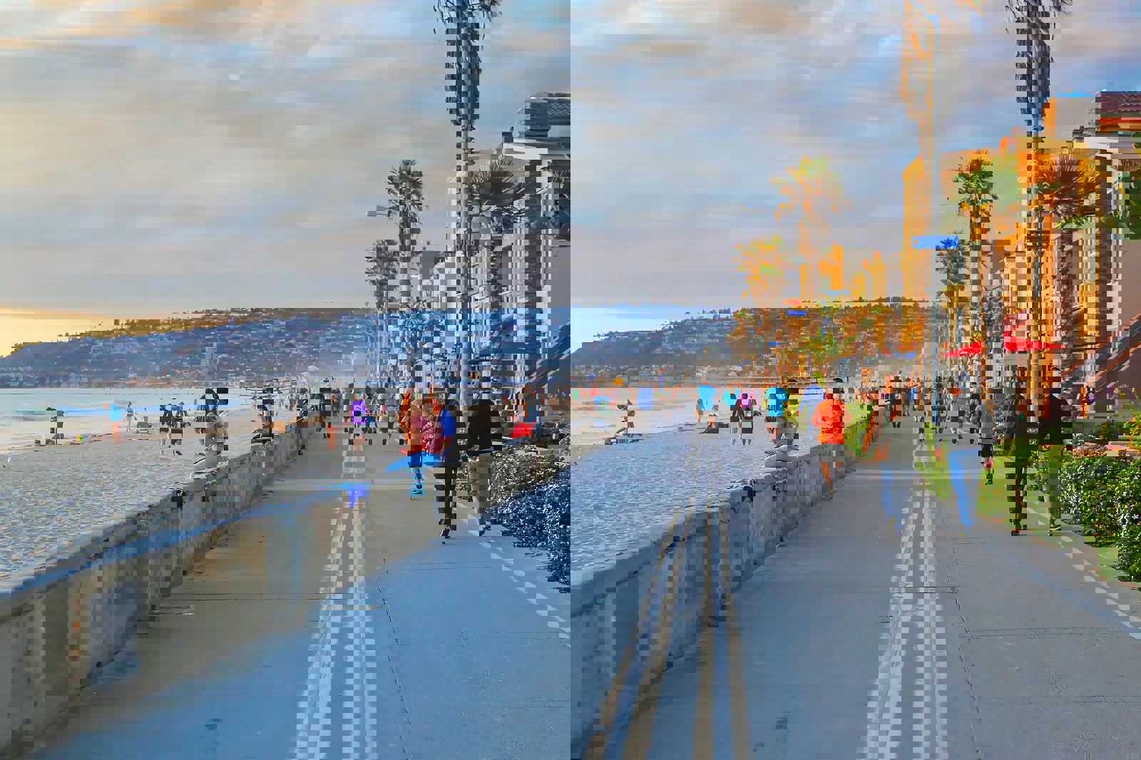 Beach clubs and relaxed eateries before the pier in Pacific Beach