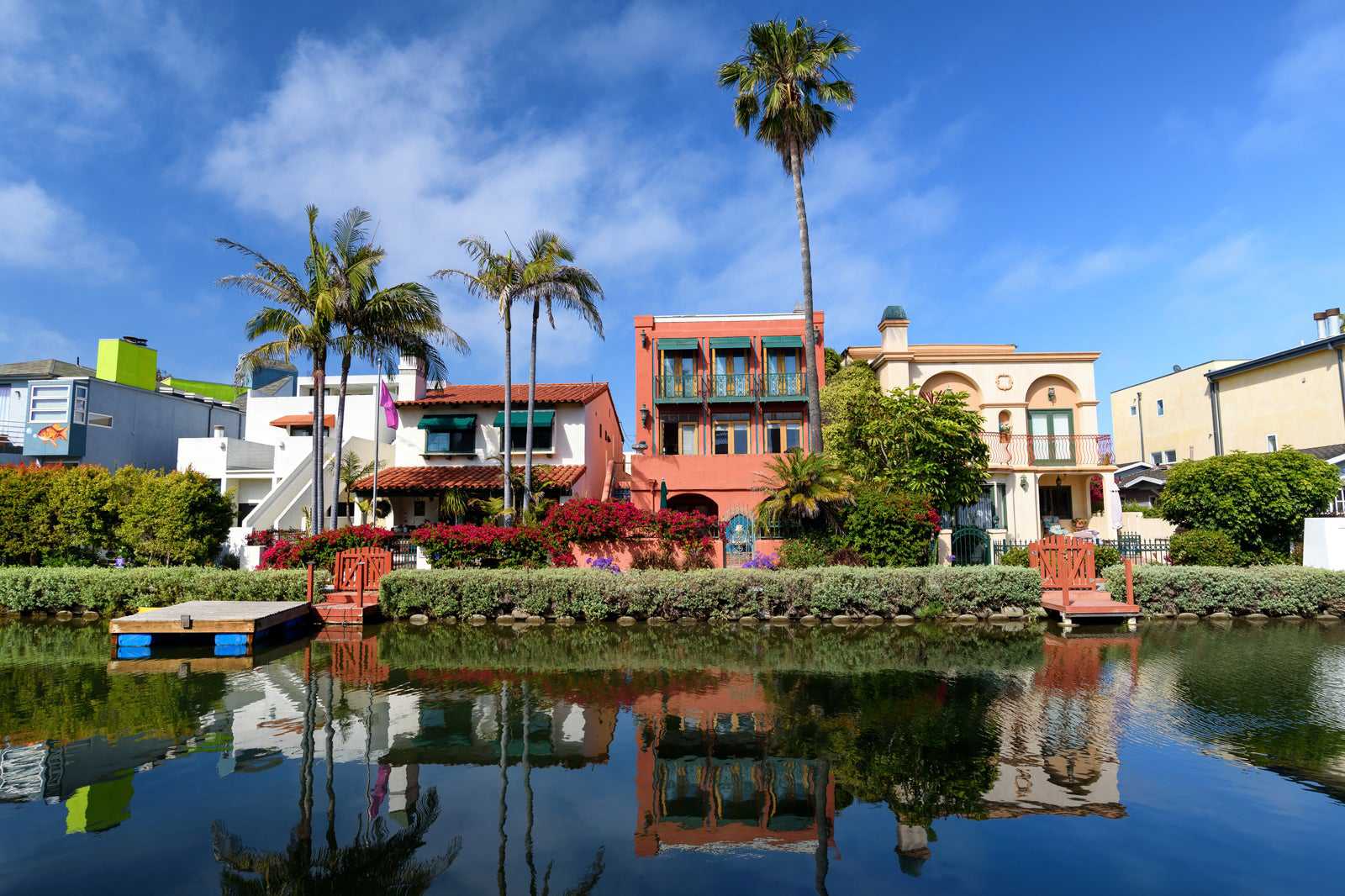 The Venice Canals are a series of waterways within a residential area that have extensive scenic walking paths alongside them. The design of the area is remarkably European, featuring an ordered grid layout and well-kept landscaping around the pavements by the canals themselves.