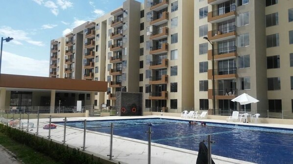 Lindo Apartamento cuenta con una piscina al aire libre y un área de picnic.