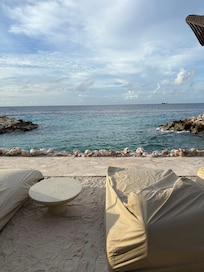 Lo que ves en las fotos es pura pantalla, hay que pagar para usar las cabañas. Los huéspedes únicamente pueden hacer uso de las pocas camas ubicadas en el “pier”. El huésped es lo último, la piscina la cierran a las 6, en lo mejor del atardecer, pues según ellos abren los restaurantes y se estorbaría. Mi cuarto imposible pues estaba encima del restaurante por lo tanto bulla y música desde las 8 am hasta pasada la media noche. Privacidad en la terraza y en la habitación , cero. En 4 servicios de house keeping ninguno fue completo y un día no hubo en el cuarto de mi hijo.y ya para rematar el último día al llegar de la playa en la tarde la puerta estaba abierta. No lo recomiendo y no volvería. Hay tres hoteles pegaditos que comparten la misma entrada al mar mucho más baratos y el desayuno en el Dive ……es delicioso y mucha variedad.