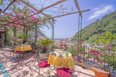 Man kan ikke kan parkere lige ved hotellet, så vi parkerede på et nærliggende hotel til 25€ pr. nat. Derefter skal man skal gå op ca. 90 ujævne og nogle steder ret høje trin for at komme op. Til gengæld er der en fantastisk udsigt fra fællesterrassen. Ellers fint ophold.