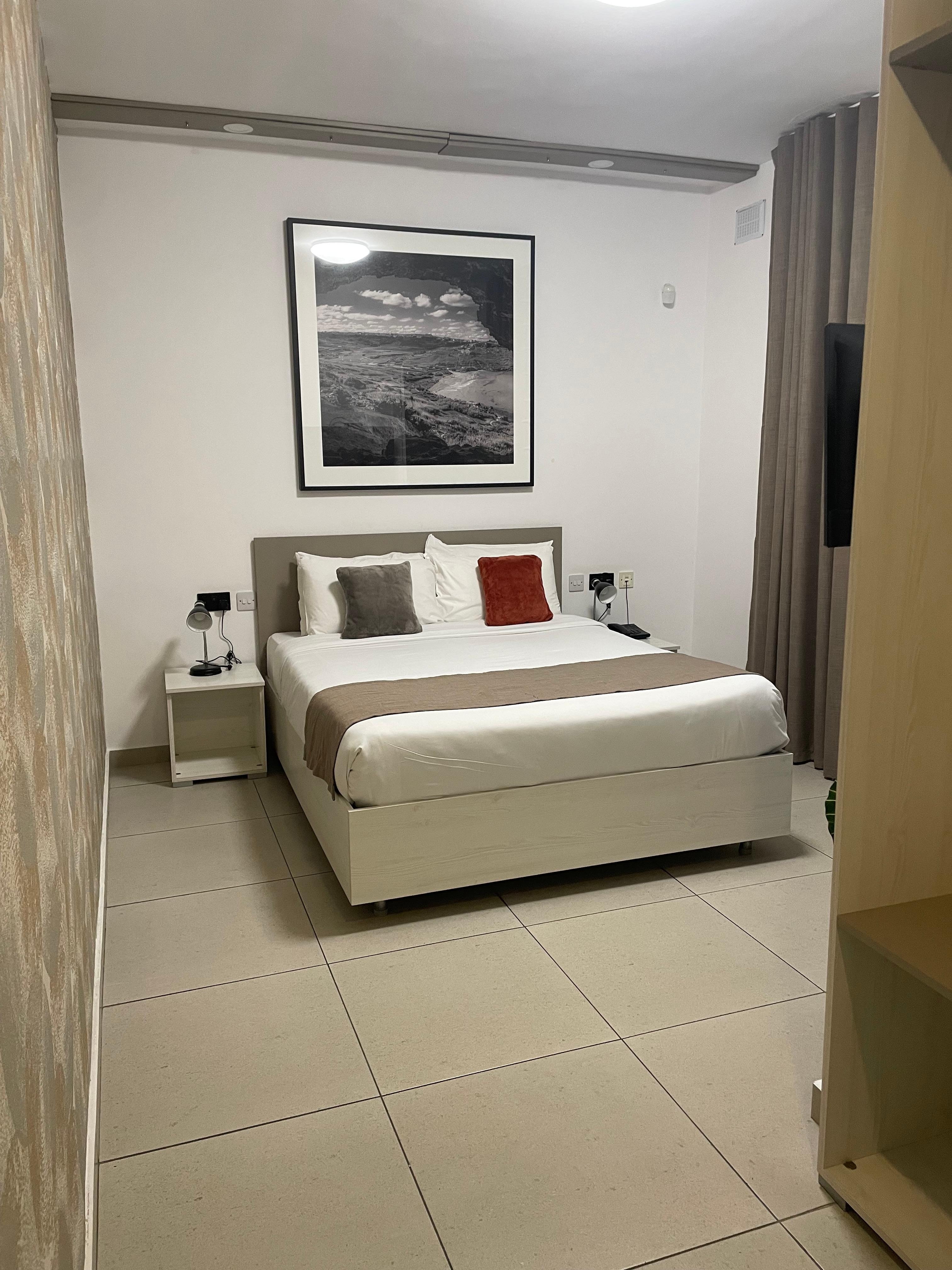 The room was a good size and very clean. Great shower and great breakfast. Restaurant and reception staff were very pleasant and helpful. 10 mins walk from where the TD3 bus from the airport stops off. Buses to Valletta from outside the hotel. Code for hotel and room entrance sent the day before arrival, which worked well. The only issue was the aircon, which was very noisy, even when switched off.