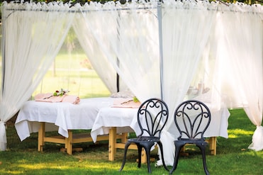 El spa ofrece tratamientos diarios en espacios dedicados, incluidas salas para parejas. Los huéspedes se relajan en saunas y jacuzzis después de pasear por el jardín.