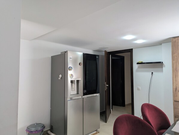 Sí, hay una cocina que también incluye utensilios de cocina, un refrigerador y un microondas.