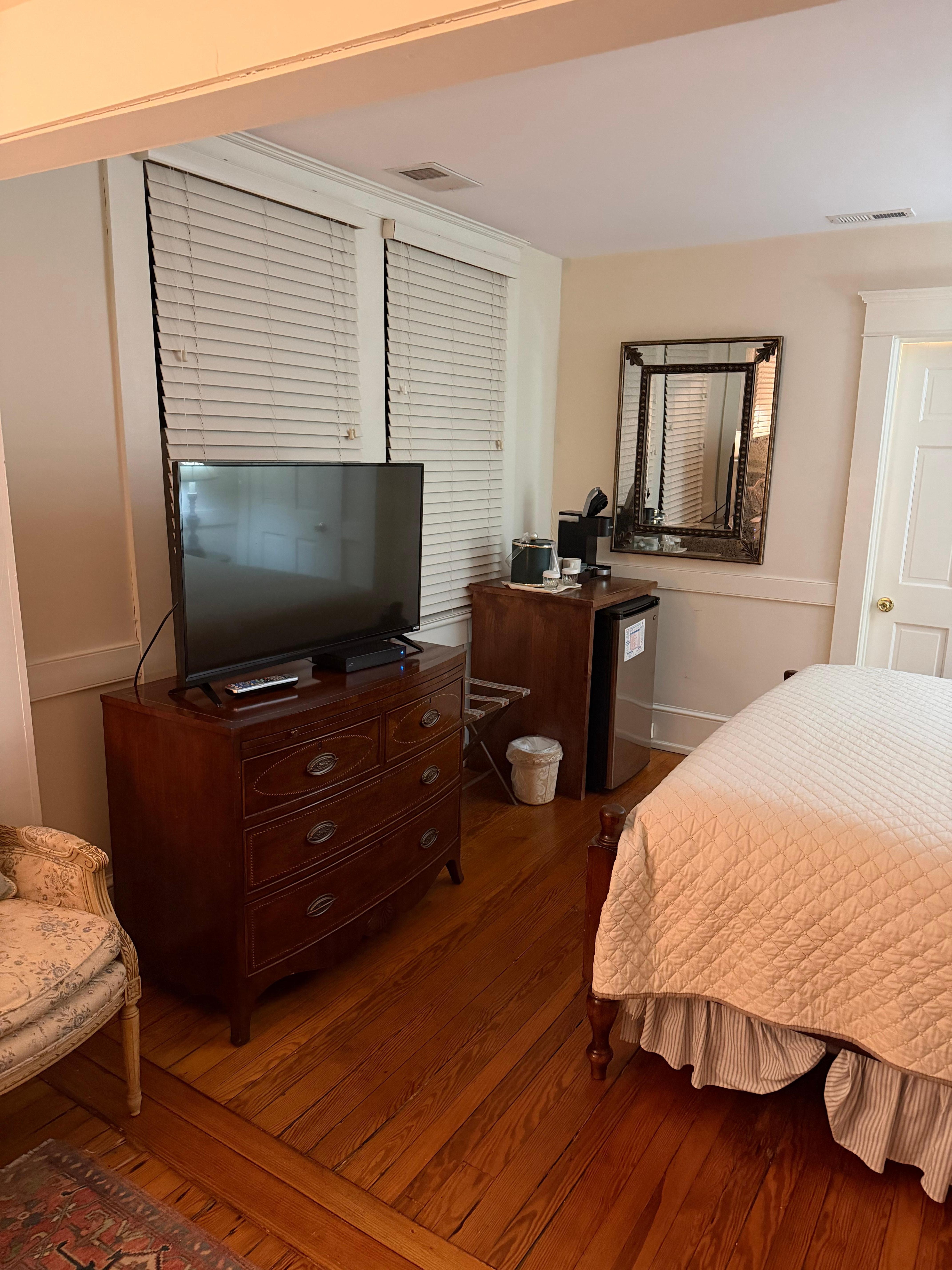 The property was two buildings on Main Street of the town of Smithfield. The building we stayed in was a detached building, The Inn itself had considerable history. When we arrived Friday evening there was a wedding event and a reception on Saturday, which occupied the main building. Since we were staying in the detached building, this was not a problem. However, on Saturday morning, we learned early that the exterior of the building was being renovated. Nail guns and banter of the work crew was a bit jolting. We were visiting family so we did not spend a lot of time there during the day. There was a dinning room and bar in the main building but we did not experience either. Being an old building we found there were not sufficient electric outlets for the items we usually travel with, computer and recharging of devices, phones, etc. There was a TV in our room but the offerings were very limited. The bed was comfortable but it did not leave much space to get around in the room. The bathroom was sufficient and the shower had been renovated.